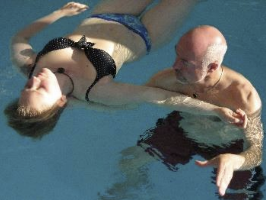 Später legt er meine Hand auf meine Brust und unterstützt durch leichten Druck seiner darauf liegenden Hand meine Atmung. Ich fühle mich neu geboren, könnte ewig so im warmen Wasser liegen, fürsorglich und liebevoll getragen……..